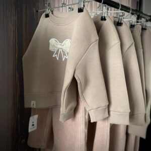 Medvilninio trikotažo kostiumėlis. Džemperis su pūkeliu, kelnytės be pūkelio. Kelnių audinys primena velvetą, stulpelinis trikotažas, labai švelnus.