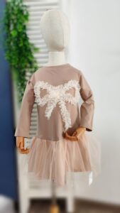 Kilpinio trikotažo suknytė su tiulio sijonuku ir iškiliu kaspinu.
